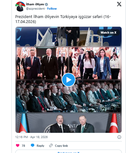 Azərbaycan Prezidenti İlham Əliyevin Türkiyəyə işgüzar səfəri ilə bağlı "X" sosial şəbəkə hesabında video paylaşılıb.